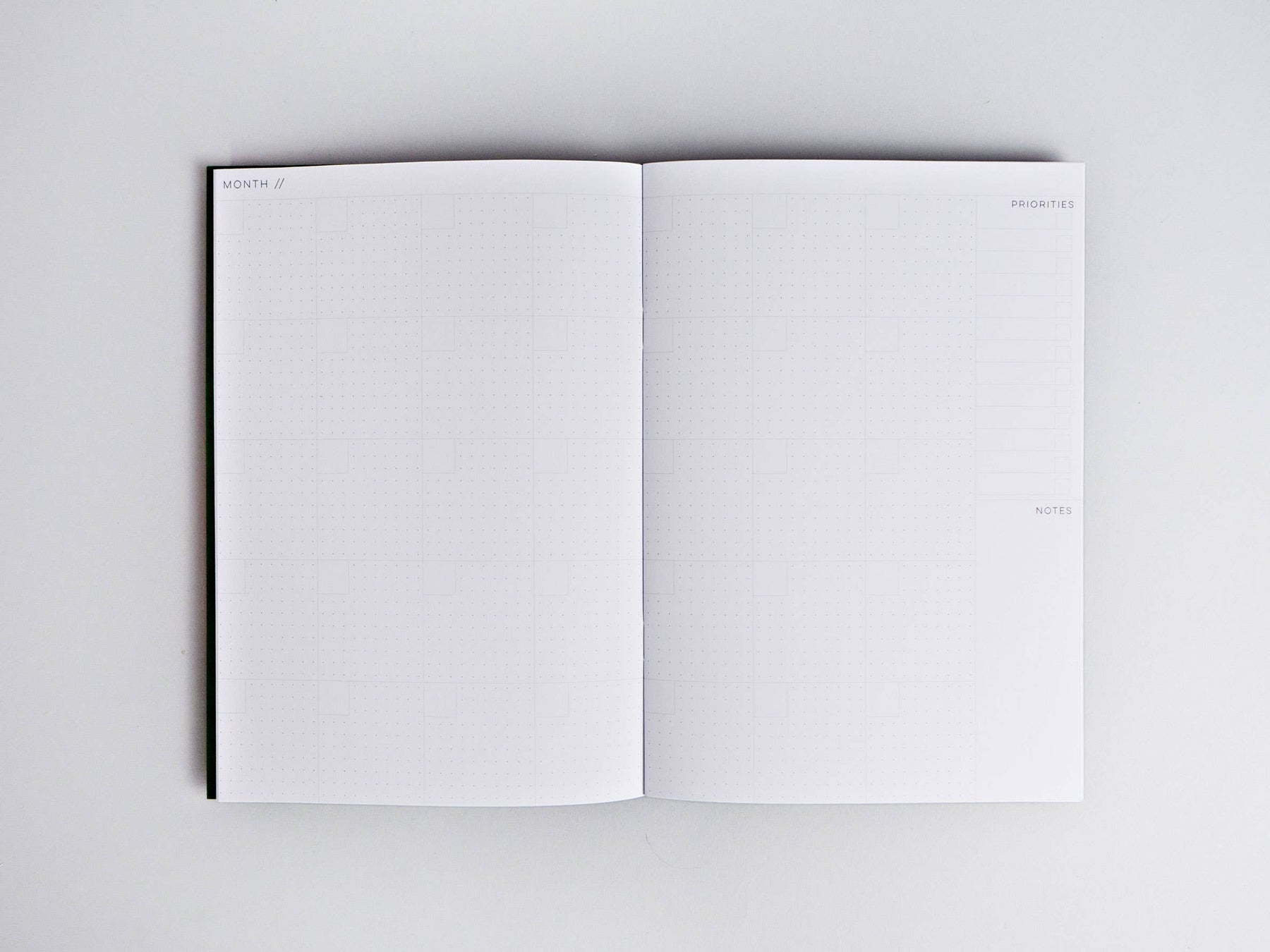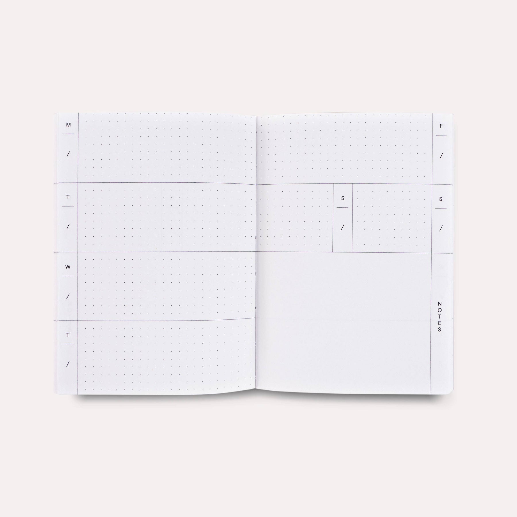 A5 size, lay-flat ota binding. Undated format for year-round use, with 52 weeks (5 full day pages, and a split weekend page) 90gsm fountain-pen friendly sheet music paper, with a textured, 250gsm soft cover.