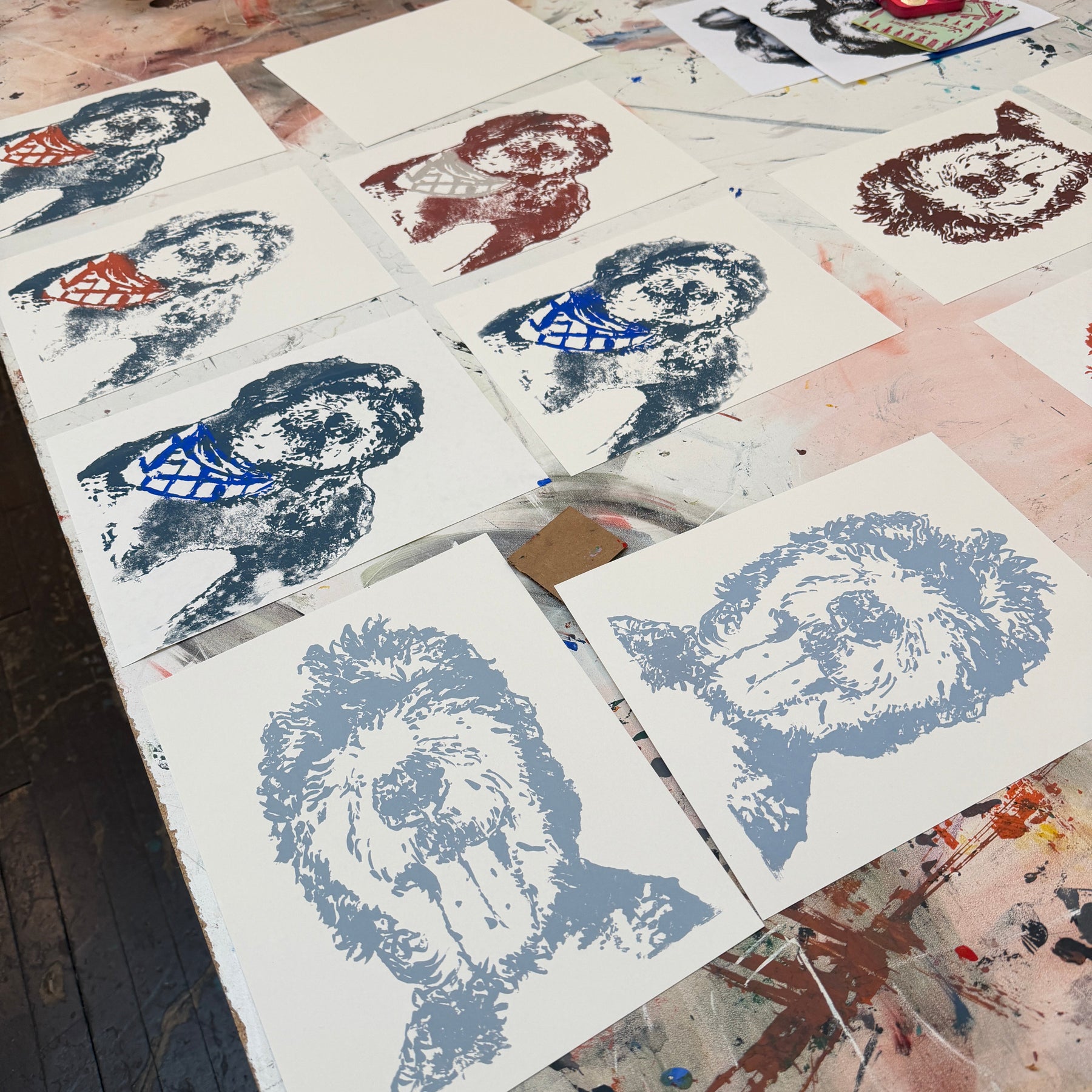 Learn the basics of screen printing and create a hand illustrated portrait of your favorite furry friend. We'll be using an accessible, non-darkroom method that can easily be replicated at home. Each participant will create an edition of 6 handmade, 8"x10" custom portraits of their own pet using drawing templates and Melissa’s guidance.