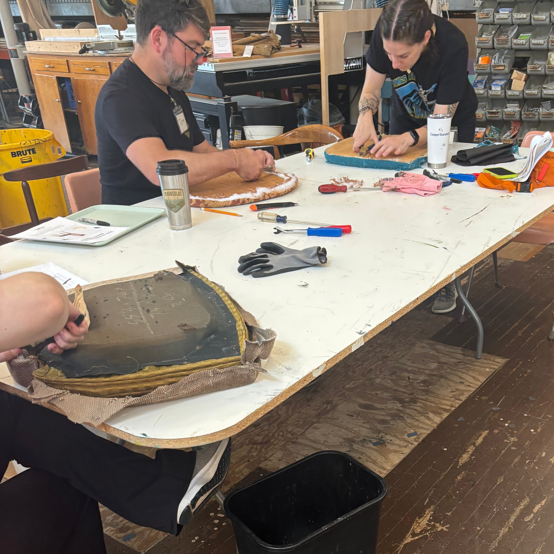Day 2 is for rebuilding. We will be making our chairs better than ever! Get hands-on experience in choosing fabrics, working with foam and dacron, while you learn the fundamentals to create comfortable and structurally sound seating.