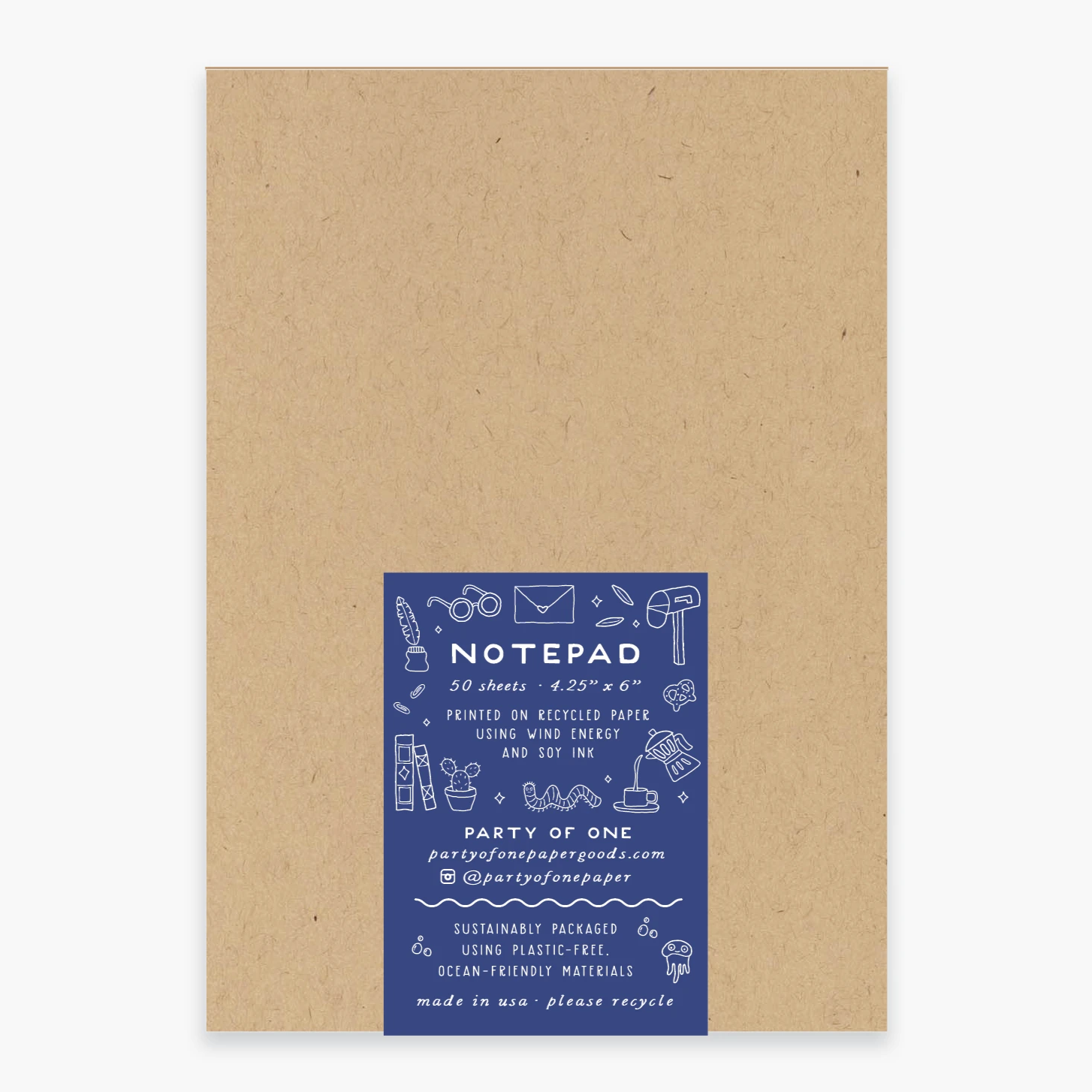 • 4.25" x 6" • 50 sheets • Sustainably packaged with cardstock cover, chipboard backing & wraparound sticker label • Plastic-free & ocean friendly • Printed on recycled paper using 100% wind energy and soy ink