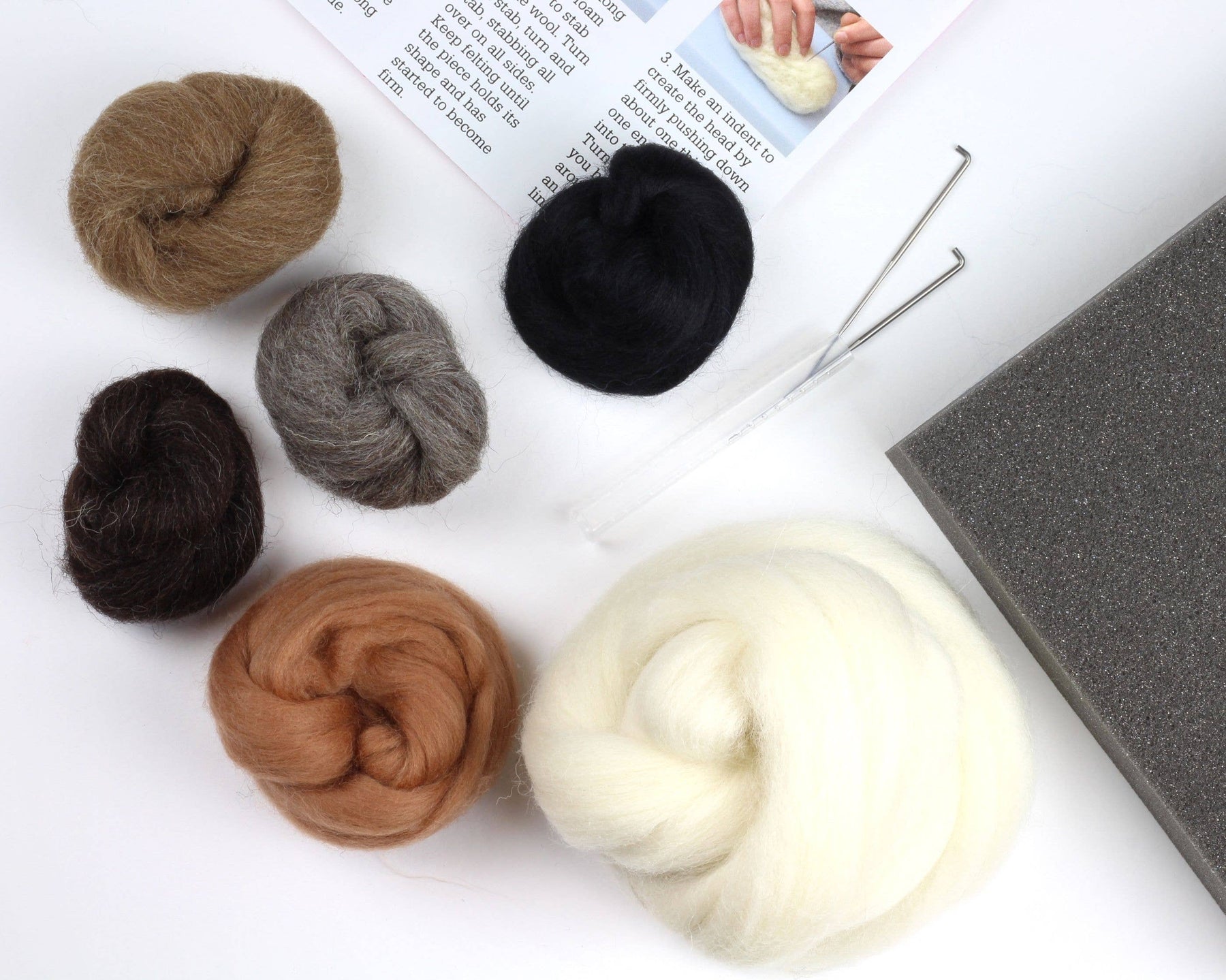 Each kit contains: Wool in a variety of breeds & colors, 2 felting needles in a secure holder, detailed instructions with step-by-step photos, in a beautiful gift box.